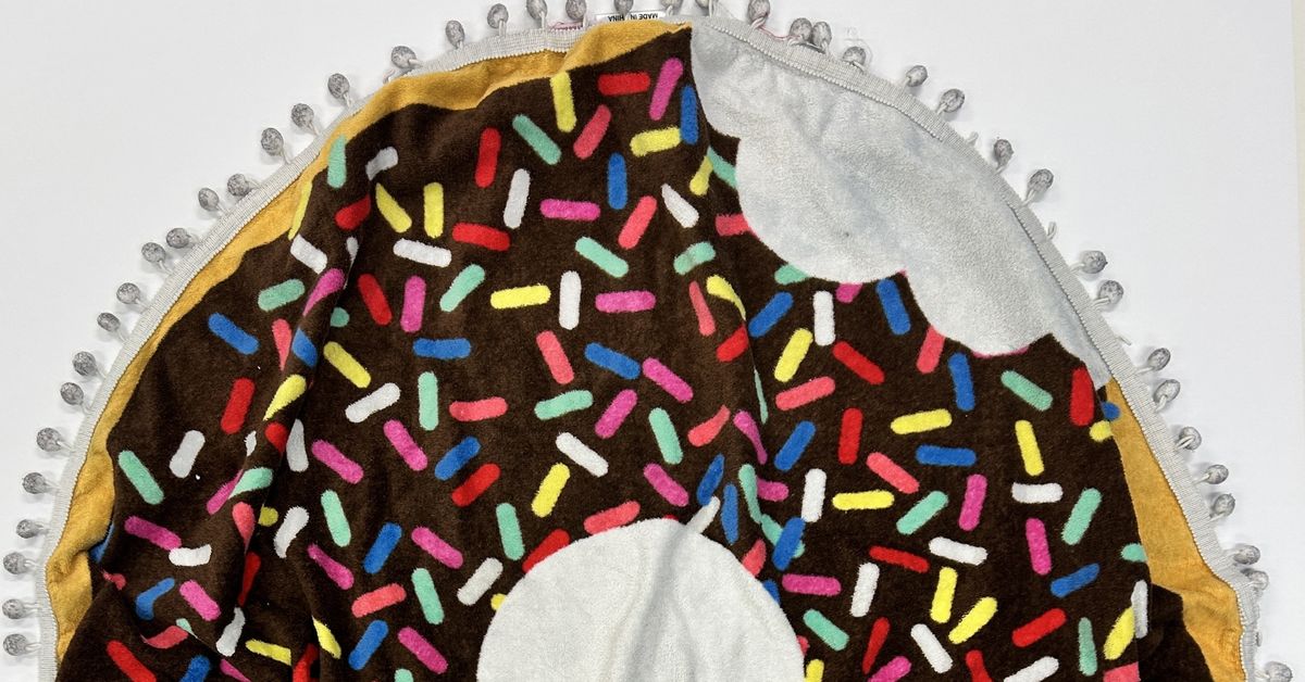 É uma manta circular representando um donut com granulado.