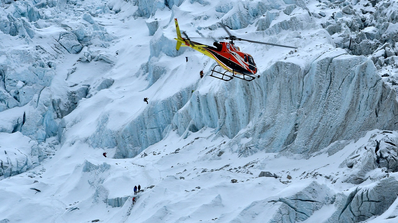 As equipes de resgate carregam um sherpa ferido por uma avalanche que achatou partes do Everest Base Camp em 2015. (Roberto Schmidt/AFP via Getty Images)