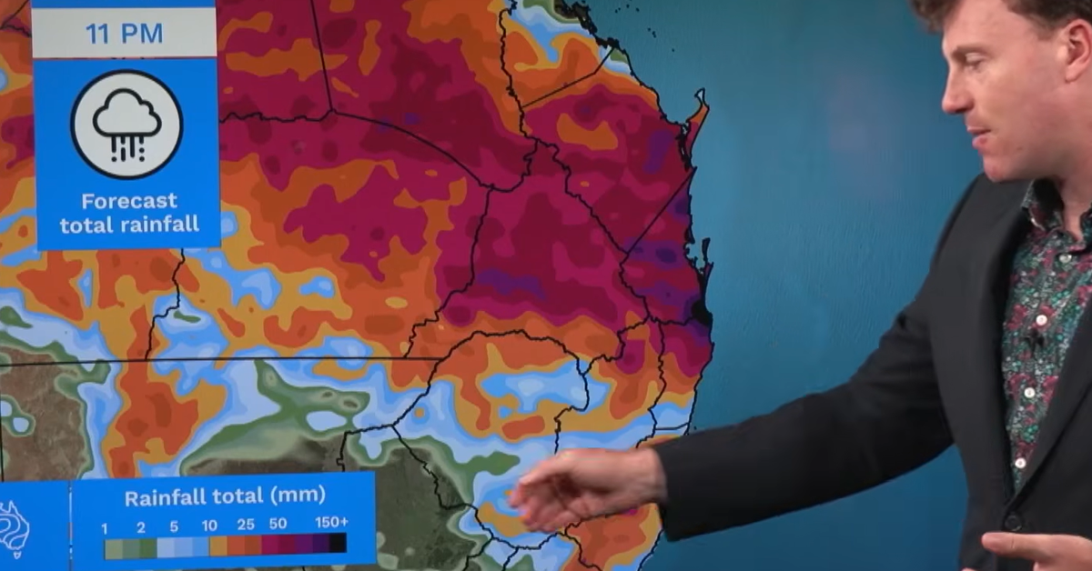 A previsão do BoM previa totais de 30 a 40 mm em Brisbane na sexta-feira e a possibilidade de chuvas localmente intensas entre 100 e 200 mm.