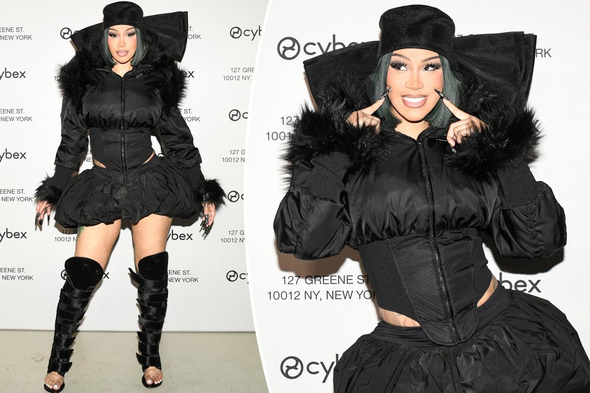 A rapper exibiu sua figura pós-bebê em uma dramática jaqueta preta com espartilho e acabamento em pele sintética, combinada com uma minissaia com bainha bolha combinando. Cardi B/Instagram