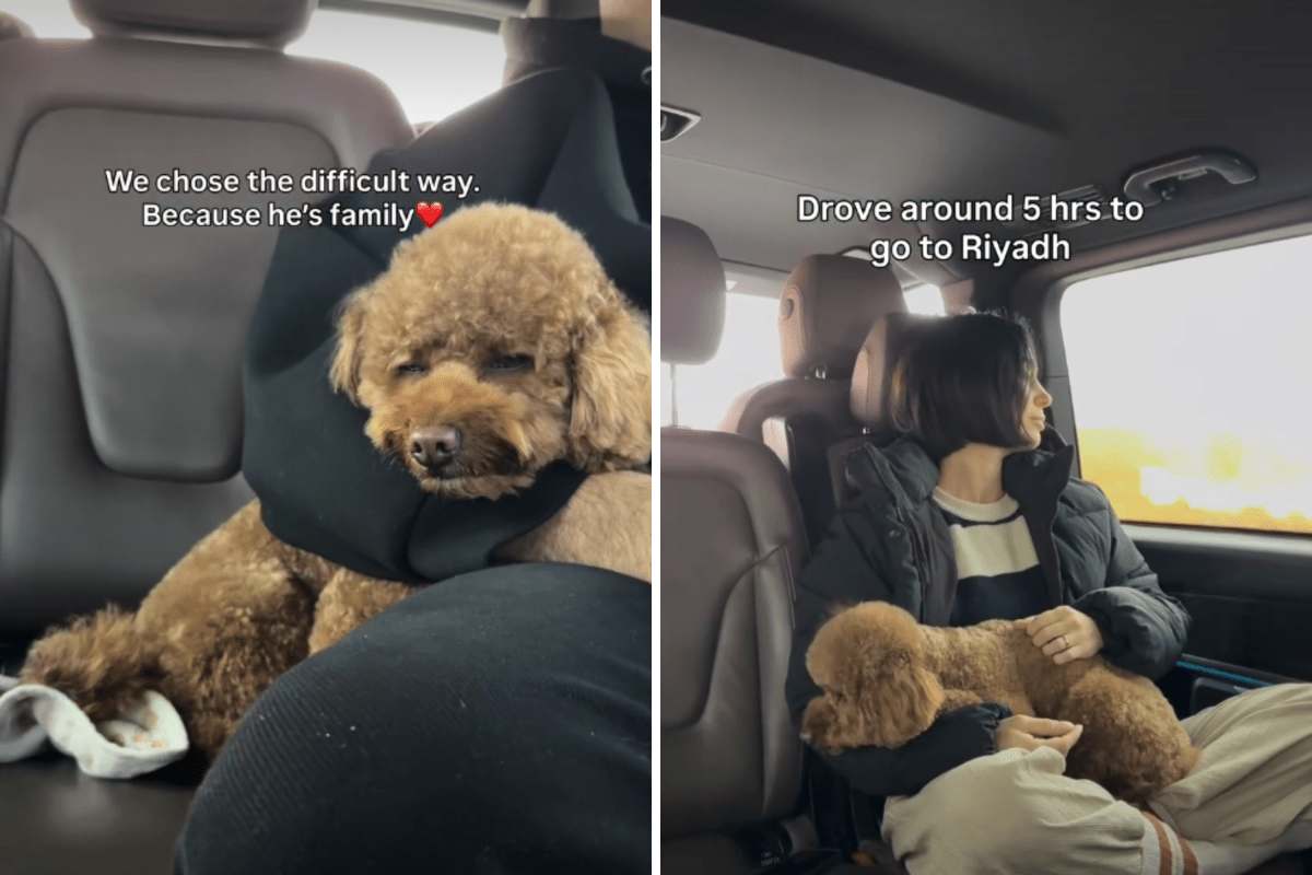 Deixar o filhote para trás, no entanto, nunca foi considerado. “Ele é nossa família”, afirma a legenda. A única opção era dirigir de Doha, no Catar, até Riad, na Arábia Saudita, cruzar a fronteira por estrada e depois continuar por via aérea.