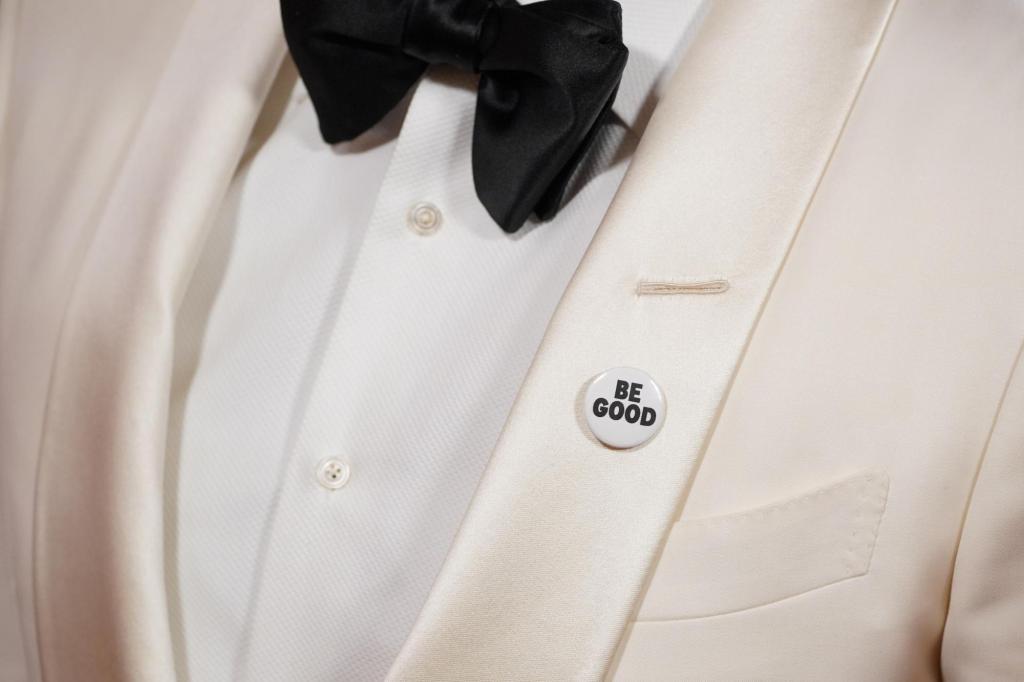 Os distintivos em preto e branco exibiam slogans como “BE GOOD” e “ICE OUT”, introduzindo um ângulo político na premiação após a cerimônia relativamente apolítica do ano passado.