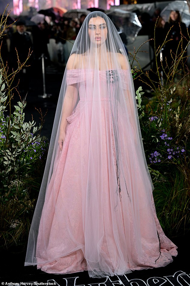 Sua roupa foi completada com um véu completo enquanto ela refletia a cena do casamento de Margot no filme.