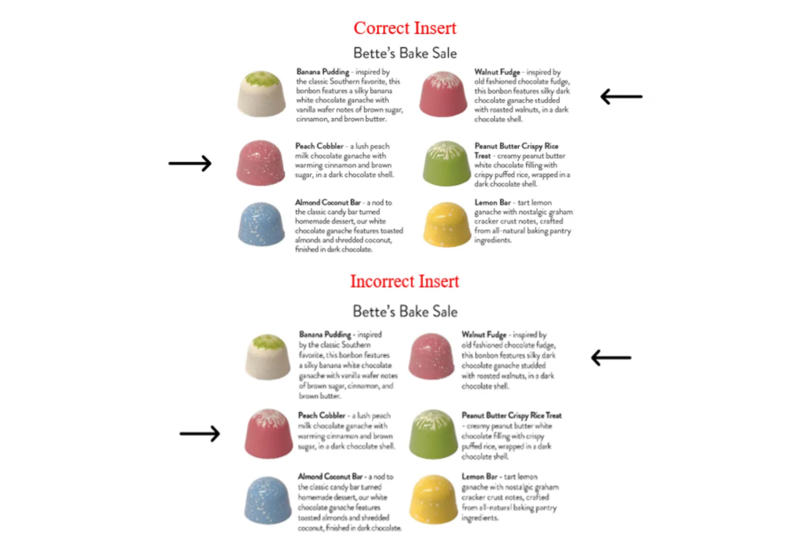 O guia identificou incorretamente um bombom Walnut Fudge – aquele que contém nozes – como um bombom Peach Cobbler, enquanto a variedade de pêssego foi rotulada como noz. Como resultado, os consumidores que confiam nas notas de degustação podem, sem saber, comer um chocolate contendo nozes.