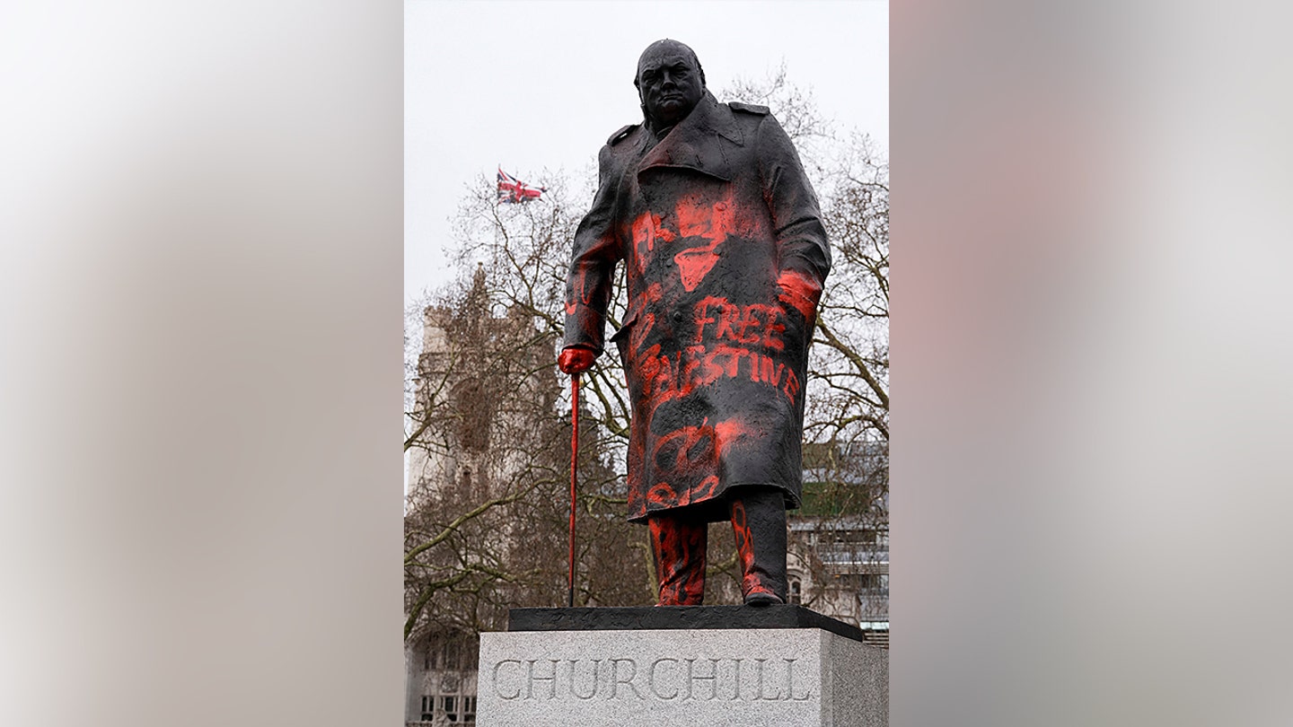 A estátua de Sir Winston Churchill, que foi desfigurada durante a noite com tinta vermelha e as palavras “Palestina Livre”, na Praça do Parlamento, Londres, Grã-Bretanha, 27 de fevereiro de 2026. (REUTERS/Carlos Jasso)