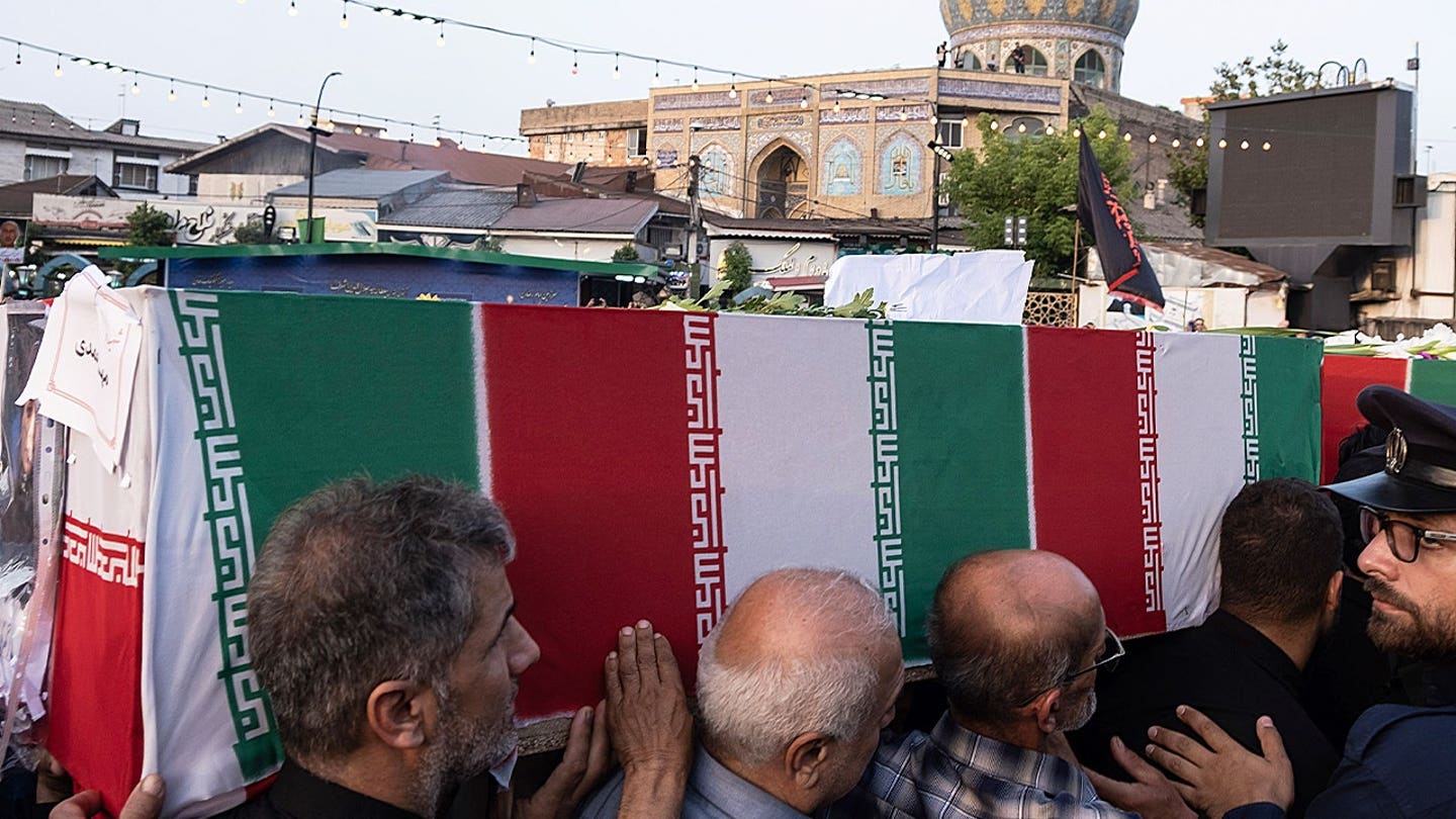 Pessoas em luto se reúnem em torno dos caixões cobertos com bandeiras dos generais das forças armadas iranianas, cientistas nucleares e seus familiares nos caminhões, que foram mortos em ataques israelenses, durante a cerimônia fúnebre em Teerã, Irã, sábado, 28 de junho de 2025. (Vahid Salemi/AP)