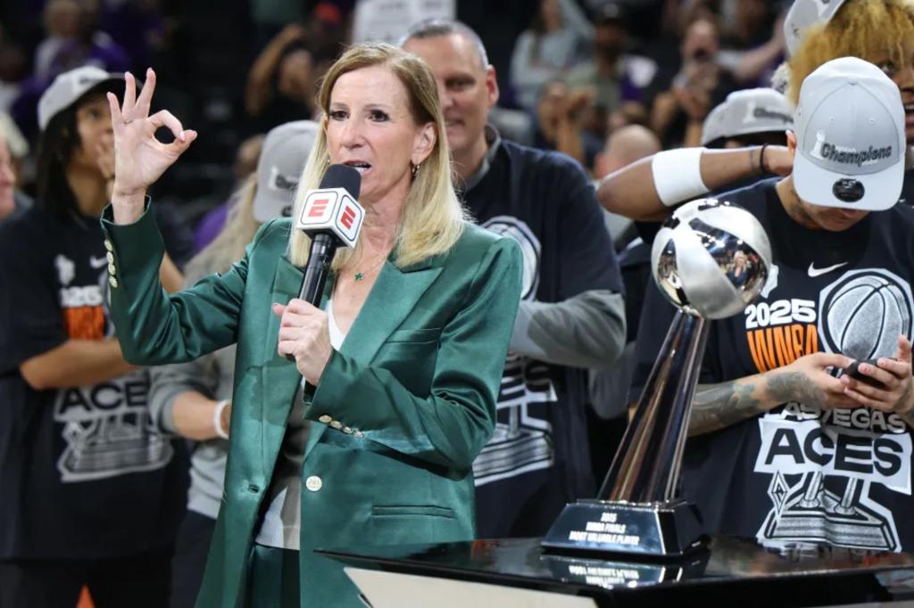 A comissária da WNBA, Cathy Engelbert, foi abafada por vaias ao entregar aos Ases o troféu do campeonato após a vitória decisiva sobre o Mercury na final da WNBA em 10 de outubro de 2025. Imagens Getty