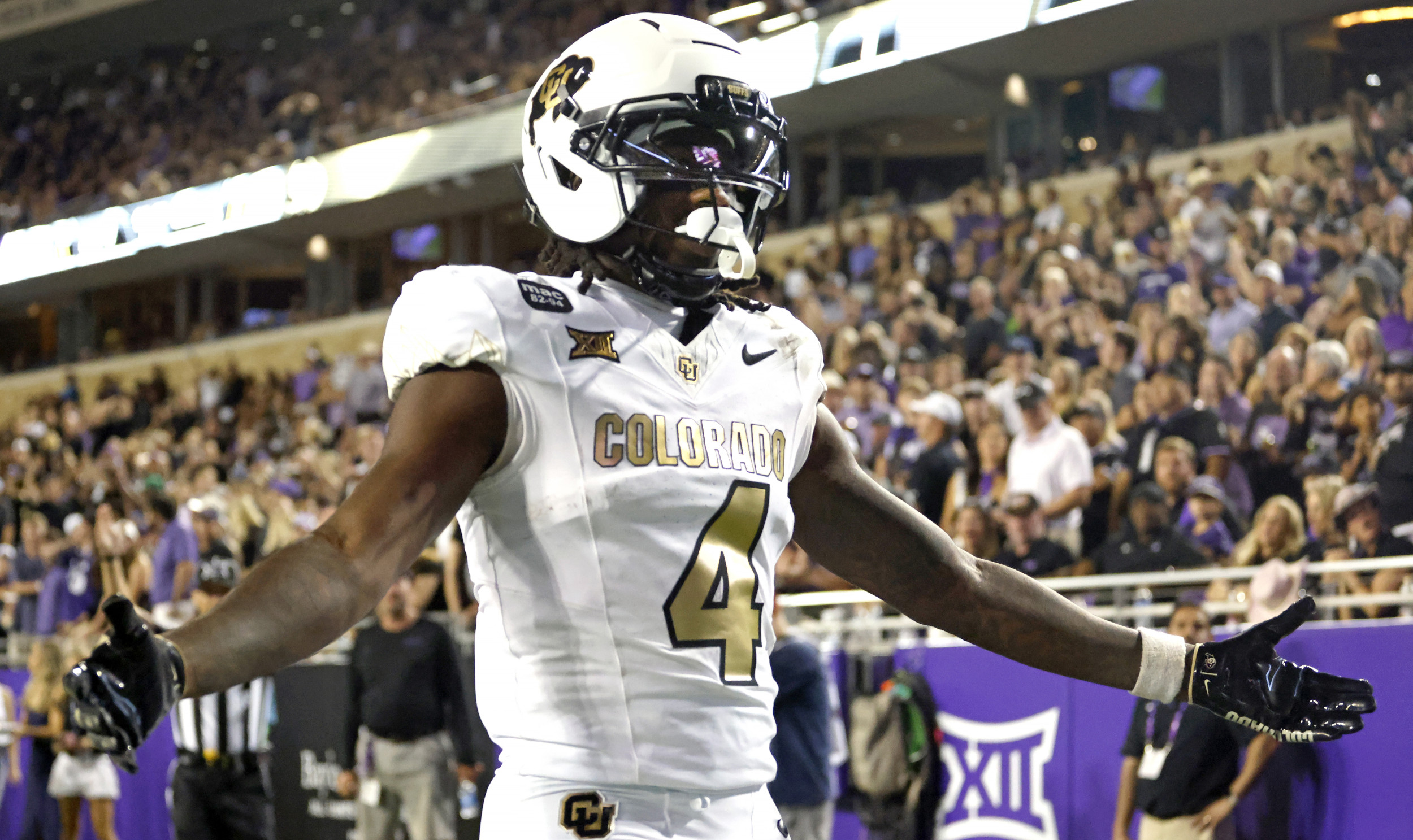 Omarion Miller nº 4 do Colorado Buffaloes comemora depois de conseguir um passe para gol durante o segundo 50% contra o TCU Horned Frogs na Amon G. Carter Arena em 4 de outubro de 2025 em Ft Well Worth, Texas.