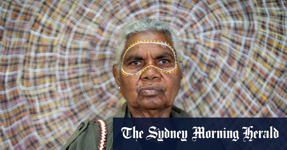 O trabalho de Gaypalani Wanambi transforma sinais de trânsito metálicos encontrados. É a estreia de sua arte nos Estados Unidos.Crédito: Leigh Vogel para Sydney Morning Herald e The Age