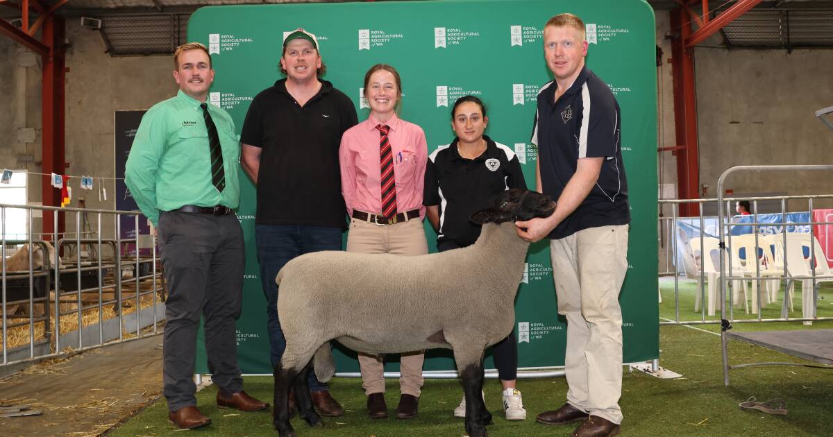 Com o carneiro Annaghdowns Suffolk de alto preço de $ 9.400 comprado pelo garanhão Rocky Ridge Suffolk, Narrogin, no Perth Royal Show de 2025 estavam Thomas Spencer, Nutrien Livestock, Callum ONeill, garanhão Annaghdowns, McAlinden, Lauren Rayner, estoque de garanhão Elders, comprador Ashley Maiolo, garanhão Rocky Ridge e Thomas ONeill, garanhão Annaghdowns. Foto de Kane Chatfield.