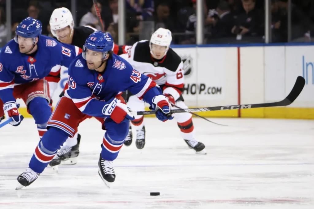 Conor Sheary nº 43 do New York Rangers patina contra o New Jersey Devils. Imagens Getty
