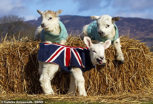 Fotos adoráveis ​​mostram cordeiros em moletons tricotados por voluntários, com Jackie ganhando um elegante pulôver Union Jack este ano