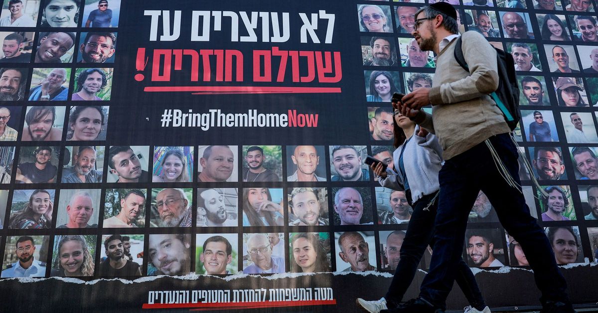 As pessoas passam por cartazes de reféns sequestrados durante o ataque liderado pelo Hamas em 7 de outubro de 2023. (Ammar Awad/Reuters via CNN Newsource)