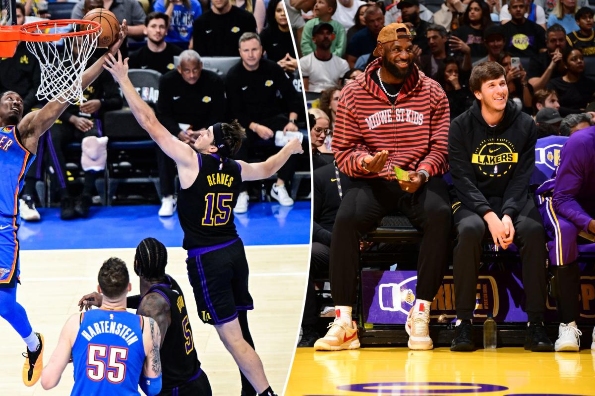 LeBron James e Austin Reaves, do Lakers, não jogaram na terça-feira contra o Thunder. Reaves está lidando com uma lesão oblíqua. NBAE por meio do Getty Images