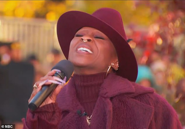 Agasalhado contra o clima, com um casaco cor de vinho enorme e um chapéu de abas largas combinando, Erivo cantou a letra antes de cortar a fita cerimonial para dar início ao 99º desfile anual.