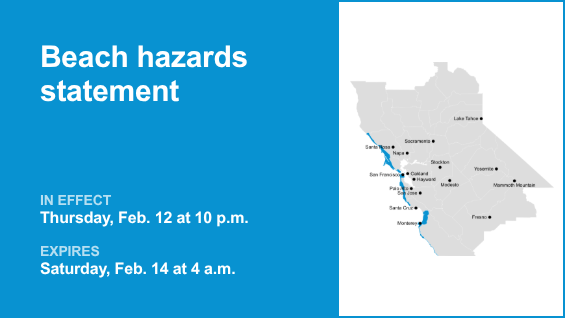 Coastal North Bay, incluindo Point Reyes National Seashore, San Francisco Peninsula Coast e Southern Monterey Bay e Big Sur Coast, bem como o condado de São Francisco, estão sob uma declaração de riscos de praia emitida pelo Serviço Meteorológico Nacional na quinta-feira às 4h25. A declaração é válida das 22h até sábado, 14 de fevereiro, às 4h