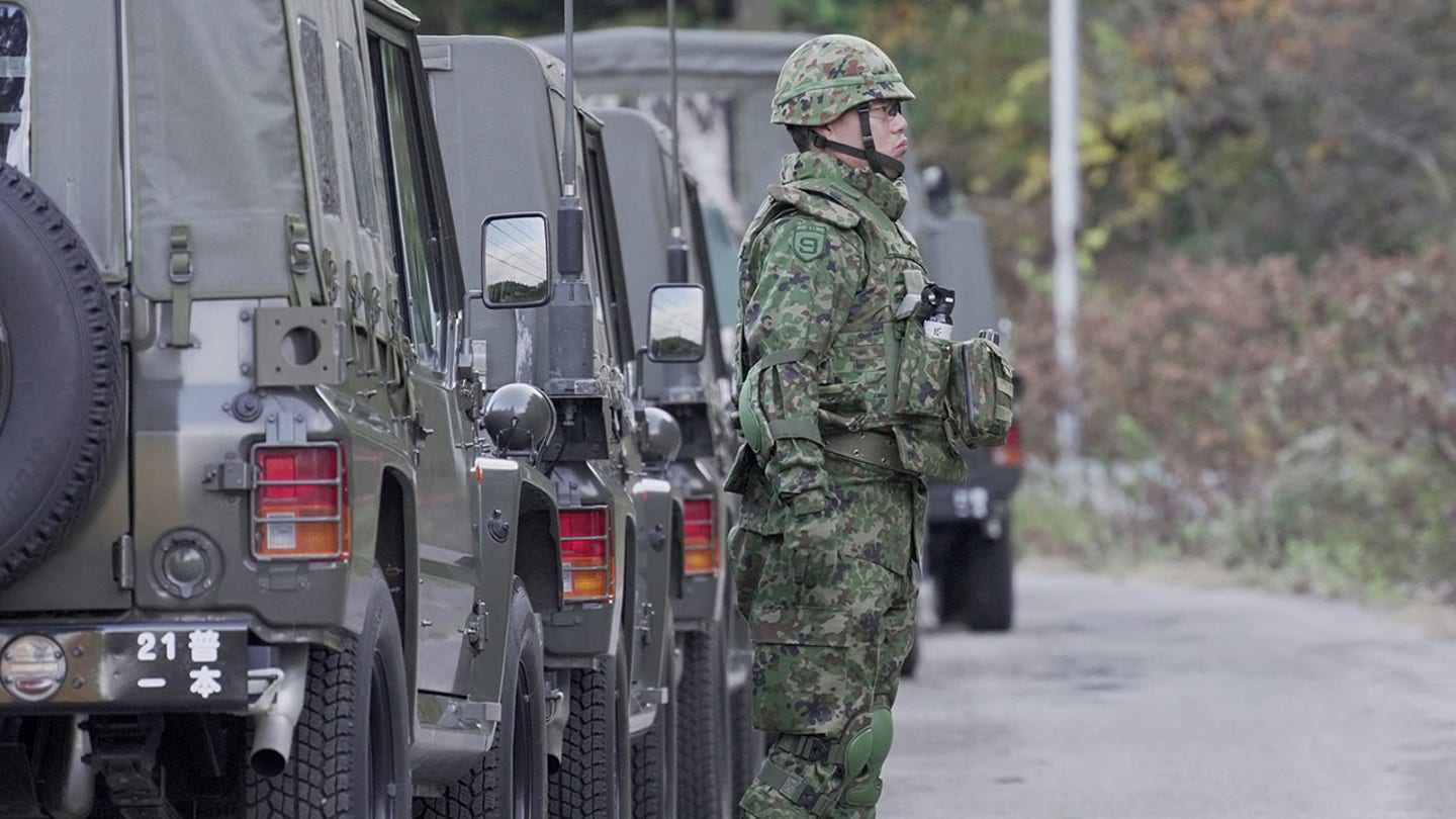 Um membro das Forças de Autodefesa do Japão (JSDF) fica ao lado de veículos militares durante um treino de montagem de uma armadilha para ursos em Kazuno, província de Akita, Japão, em 5 de novembro de 2025. (Tom Bateman/Reuters)