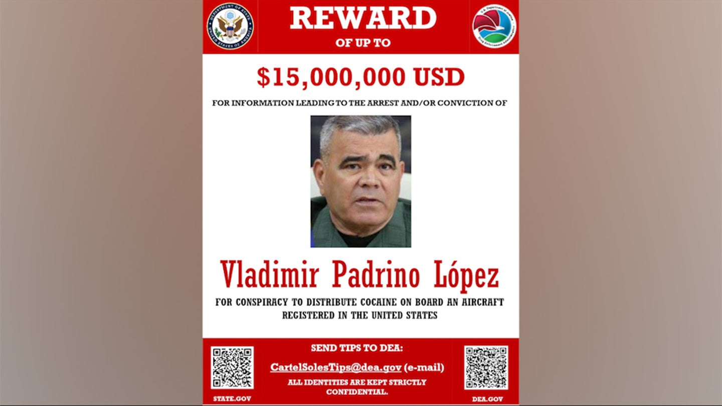 Cartazes de “procurados” do Departamento de Estado dos EUA mostram o ministro da Defesa venezuelano, Vladimir Padrino López, acusado pelas autoridades dos EUA de conspiração para distribuir cocaína a bordo de uma aeronave registrada nos EUA