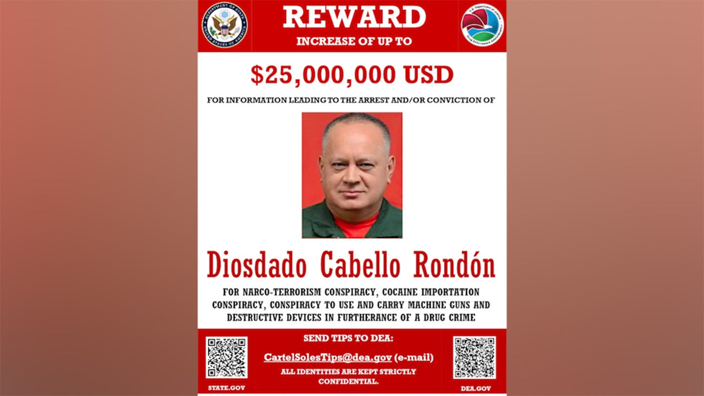 Um pôster de “procurado” do Departamento de Estado dos EUA para Diosdado Cabello Rondon, figura sênior do regime venezuelano, a quem as autoridades dos EUA acusaram de ligações com o tráfico de drogas e o narcoterrorismo (Departamento de Estado dos EUA)