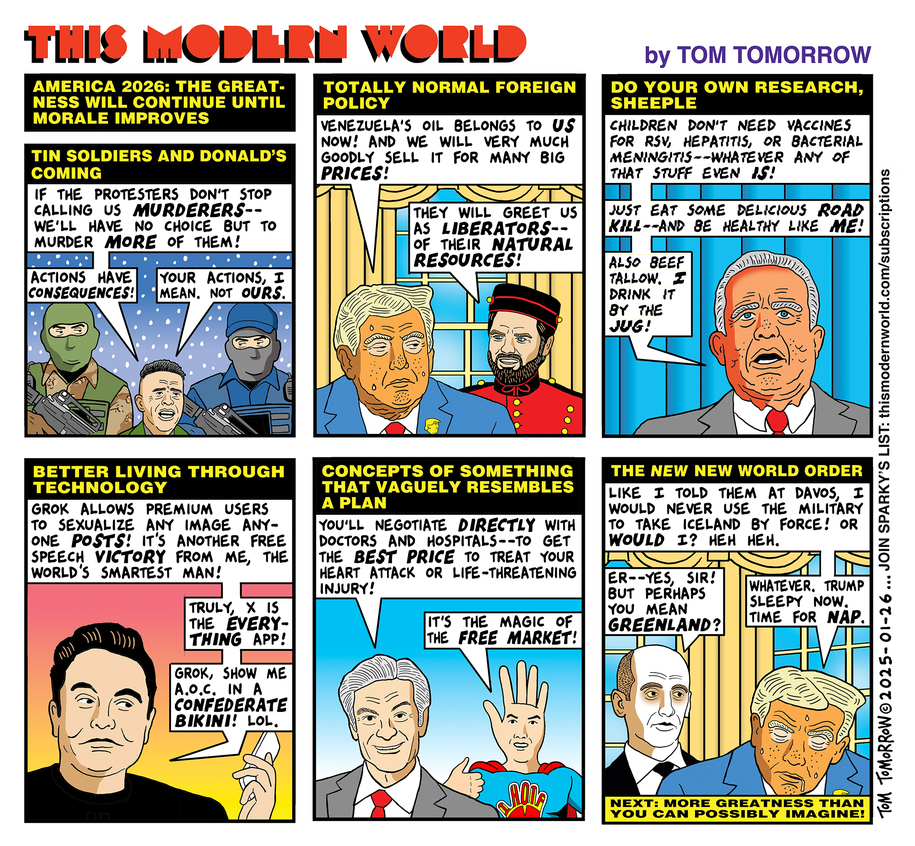 Como sempre, se você encontra valor neste trabalho que faço, considere me ajudar a mantê-lo sustentável participando do meu boletim informativo semanal, Lista de Sparky! Você pode obtê-lo em sua caixa de entrada ou lê-lo no Patreon, o conteúdo é o mesmo. Não deixe de visitar o Tom Tomorrow Merchandise Malle, se você quiser, siga-me no Bluesky!