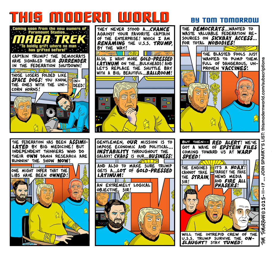 Como sempre, se você encontra valor neste trabalho que faço, considere me ajudar a mantê-lo sustentável participando do meu boletim informativo semanal, Lista de Sparky! Você pode obtê-lo em sua caixa de entrada ou lê-lo no Patreon, o conteúdo é o mesmo. Não deixe de visitar o Tom Tomorrow Merchandise Malle, se você quiser, siga-me no Bluesky!