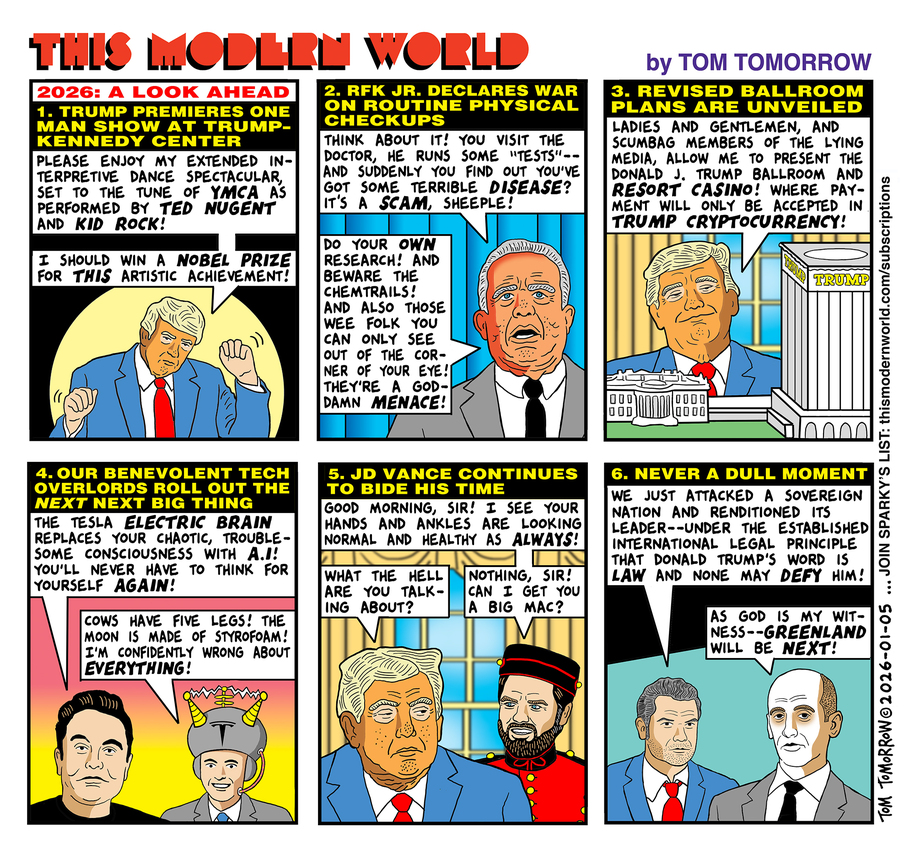 Como sempre, se você encontra valor neste trabalho que faço, considere me ajudar a mantê-lo sustentável participando do meu boletim informativo semanal, Lista de Sparky! Você pode obtê-lo em sua caixa de entrada ou lê-lo no Patreon, o conteúdo é o mesmo. Não deixe de visitar o Tom Tomorrow Merchandise Malle, se você quiser, siga-me no Bluesky!