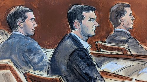 Neste esboço do tribunal, a partir da esquerda, Alon Alexander, Oren Alexander e Tal Alexander aparecem no tribunal federal de Manhattan no primeiro dia de seu julgamento por tráfico sexual, no final de janeiro. (AP)