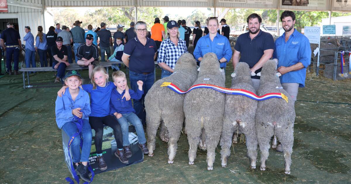 Pela terceira vez em quatro anos, o grupo de cruzamentos de raças de ovelhas britânicas e australianas patrocinado pela Farm Weekly de dois carneiros e duas ovelhas foi concedido a uma equipe de White Suffolks do garanhão Codji Springs da família Marwick, Pumphreys Bridge. Com o impressionante grupo de carneiros e ovelhas estavam Jodie Rintoul, gerente de gado da Farm Weekly (à esquerda), Courtney Marwick, co-diretora do garanhão Codji Springs, seu pai David Haines, Rechelle Marwick, mãe de Ryan Marwick, Ryan Marwick, co-diretor do garanhão, e os filhos Asha (5) e Kaylee (7) Marwick. Eles também se juntaram à juíza Emma Thompson, garanhão Hedingham White Suffolk, Wickepin, subjuiz e conexão de garanhão Tilba Tilba Merino, Kendal Heliams, Williams e juiz Clint Westphal, garanhão Wilgarna Poll Dorset, Boyup Brook. Foto de Kane Chatfield.