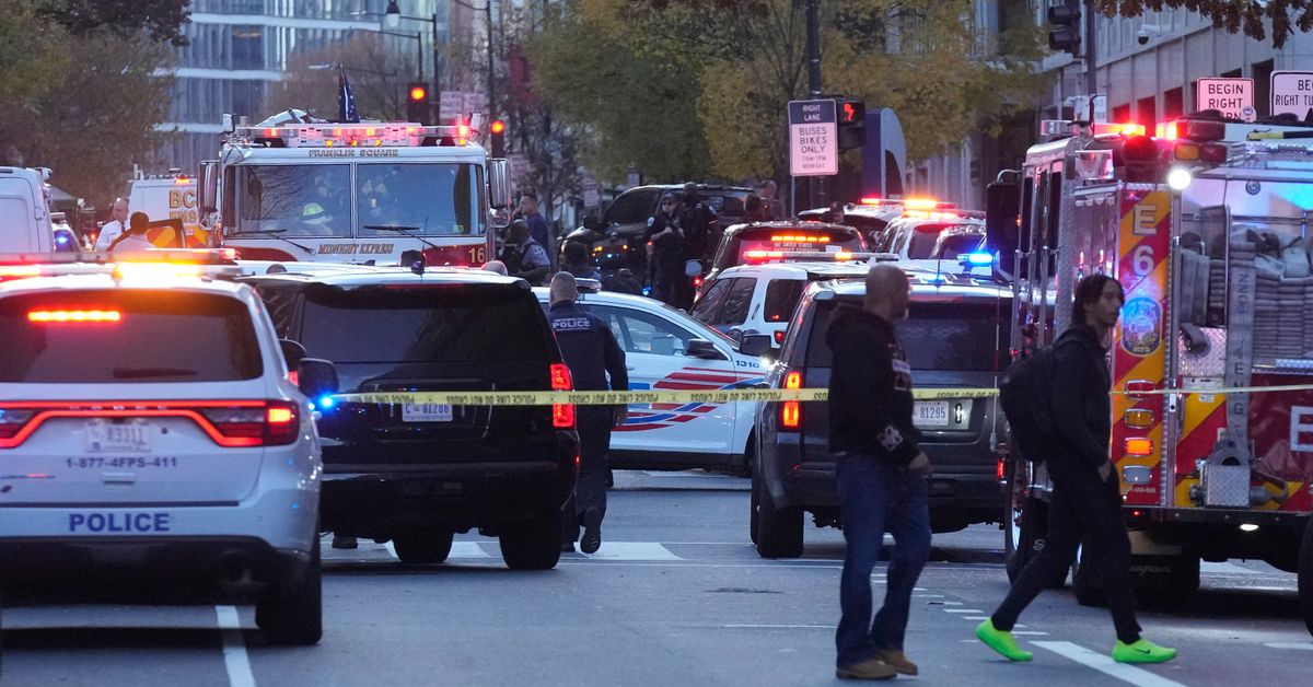 Veículos de emergência se reúnem em uma área isolada onde soldados da Guarda Nacional parecem ter sido baleados perto da Casa Branca na quarta-feira, 26 de novembro de 2025, em Washington. (Foto AP / Mark Schiefelbein) (AP)