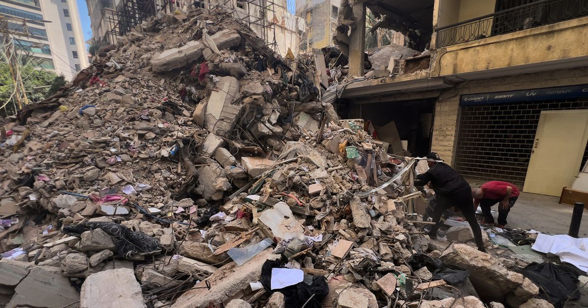 Trabalhadores procuram entre os escombros de um prédio destruído que foi atingido há uma semana por um ataque aéreo israelense no centro de Beirute, Líbano, quinta-feira, 16 de abril de 2026. (AP Photo/Hussein Malla)