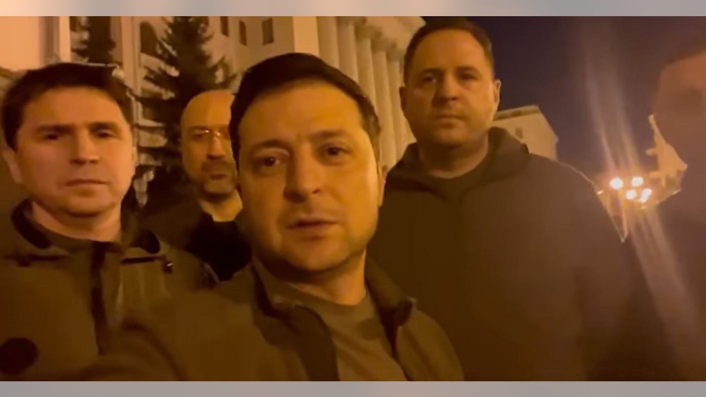 O presidente ucraniano, Volodymyr Zelenskyy, está ao lado de outros funcionários do governo num vídeo publicado nas redes sociais, prometendo defender o país de uma invasão russa. (Forças Armadas da Ucrânia)