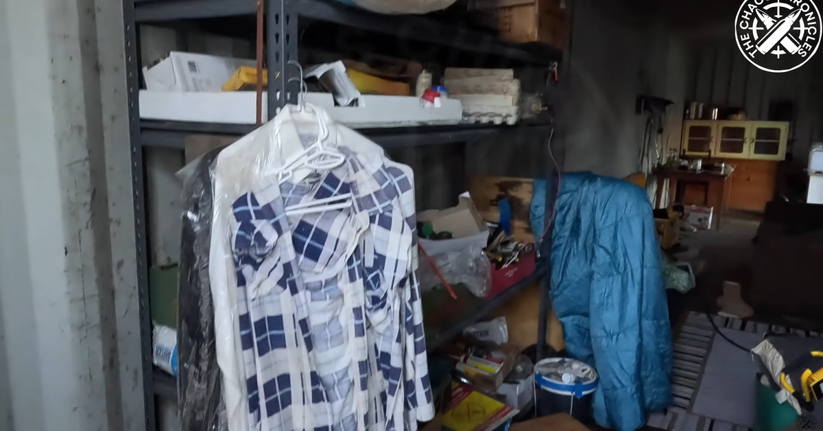 Camisas presumivelmente pertencentes ao acusado de matar policiais, Dezi Freeman, ainda estão penduradas na porta do contêiner escondido em uma propriedade de 35 hectares em Victoria’s High Country. (As Crônicas do Caos/YouTube)