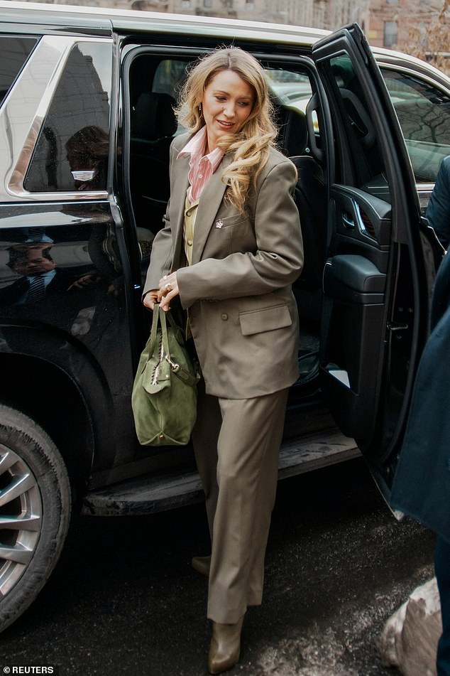 Vestindo um terno cáqui trespassado, um colete bege sobre uma camisa de botão rosa, uma bolsa de camurça verde e um broche de trevo de cinco folhas para dar sorte, Blake, 38, entrou ao lado de seus advogados para enfrentar sua co-estrela pela primeira vez desde que sua batalha legal começou em dezembro de 2024.