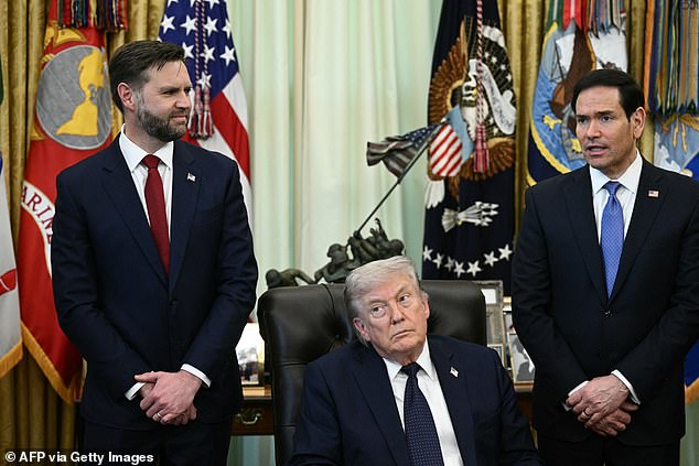 (Da esquerda para a direita) O vice-presidente dos EUA, JD Vance, e o presidente dos EUA, Donald Trump, ouvem o secretário de Estado dos EUA, Marco Rubio, falar durante uma reunião com o embaixador do Líbano nos EUA e o embaixador de Israel nos EUA, na Casa Branca em Washington, DC, em 23 de abril.