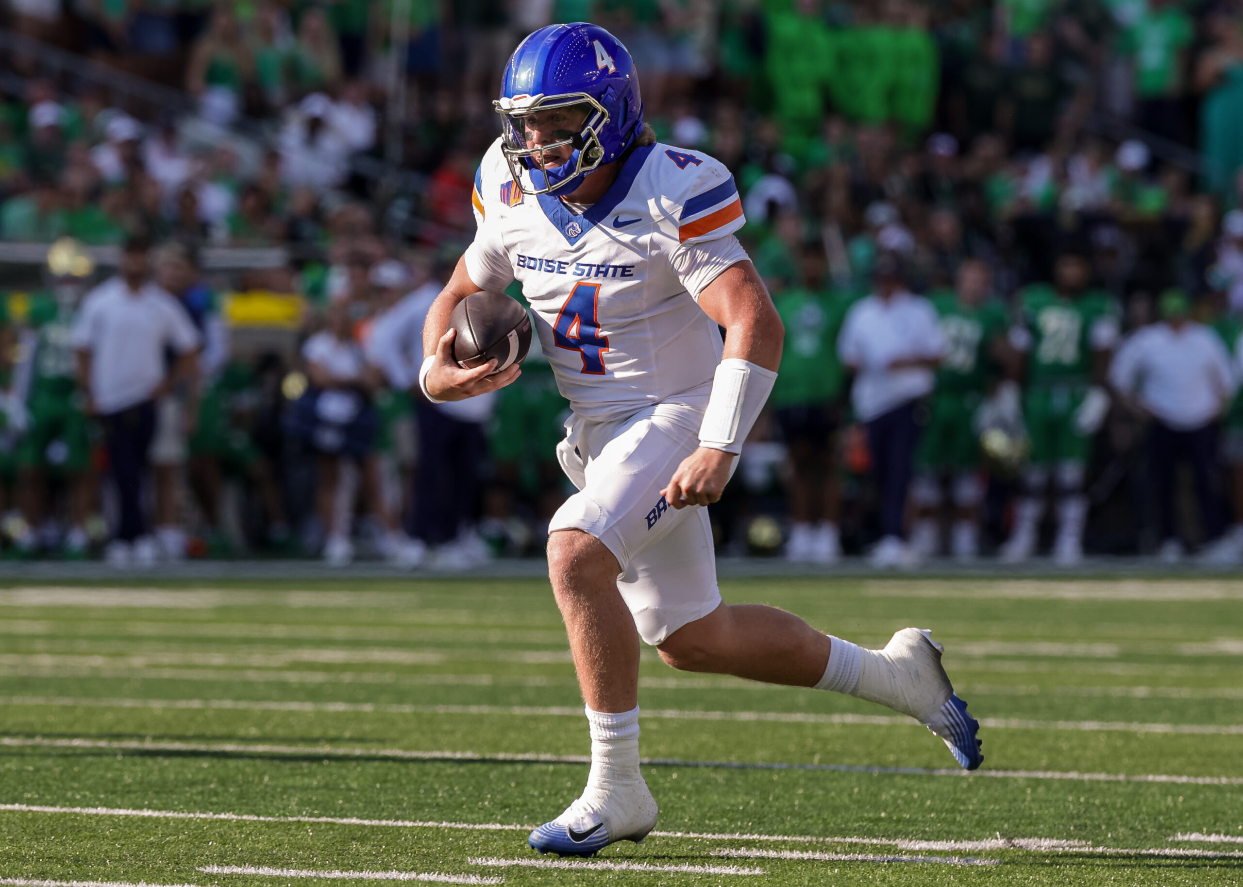 Maddux Madsen # 4 do Boise State Broncos corre a rodada durante o videogame da NCAA entre o Notre Dame Combating Irish e o Boise State Broncos na Notre Dame Arena em 4 de outubro de 2025 em …