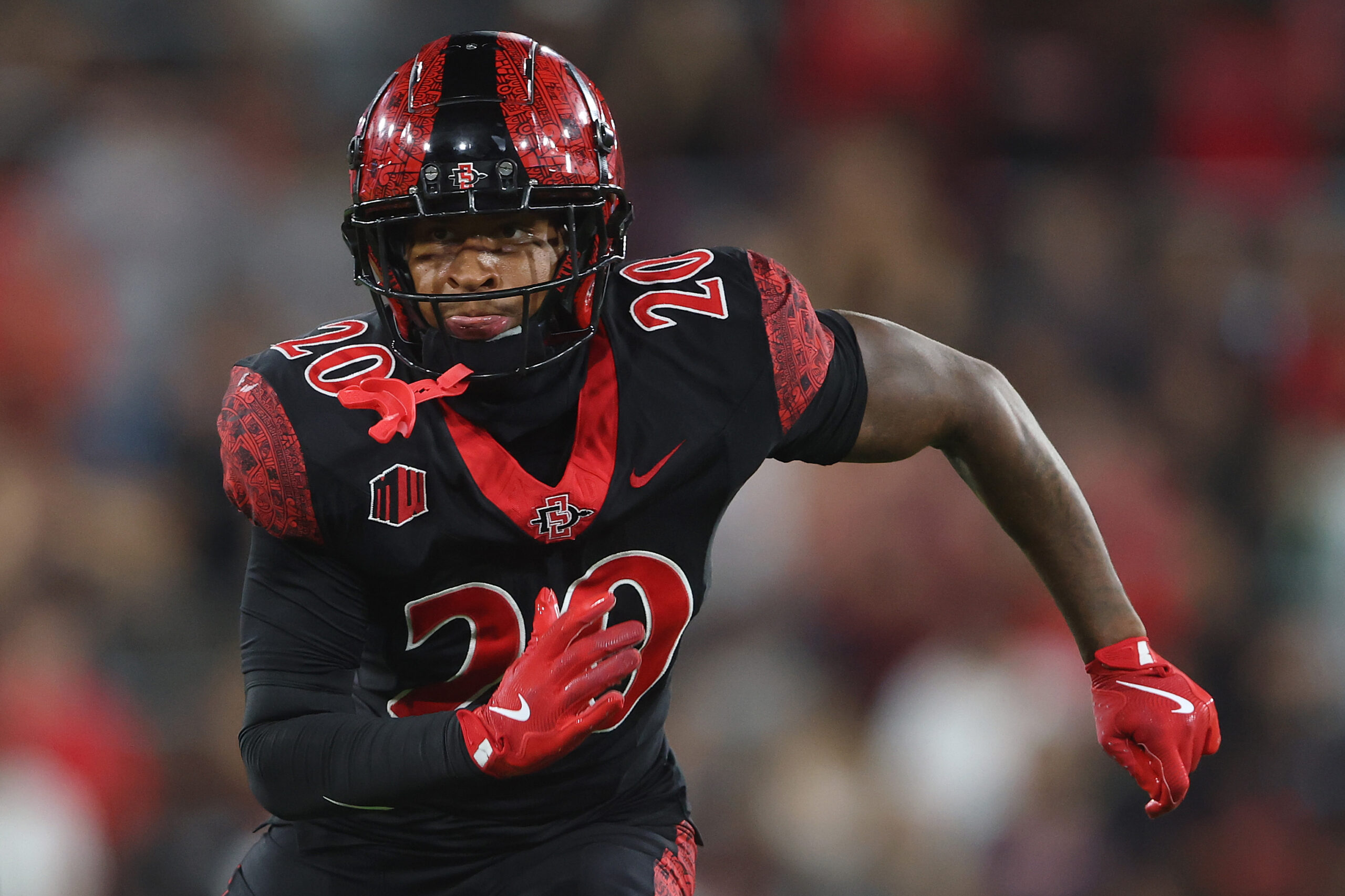 Jelani McLaughlin # 20 do San Diego State Aztecs defende durante a segunda metade de um jogo contra o California Golden Bears na Snapdragon Arena em 20 de setembro de 2025 em San Diego, The Golden State.