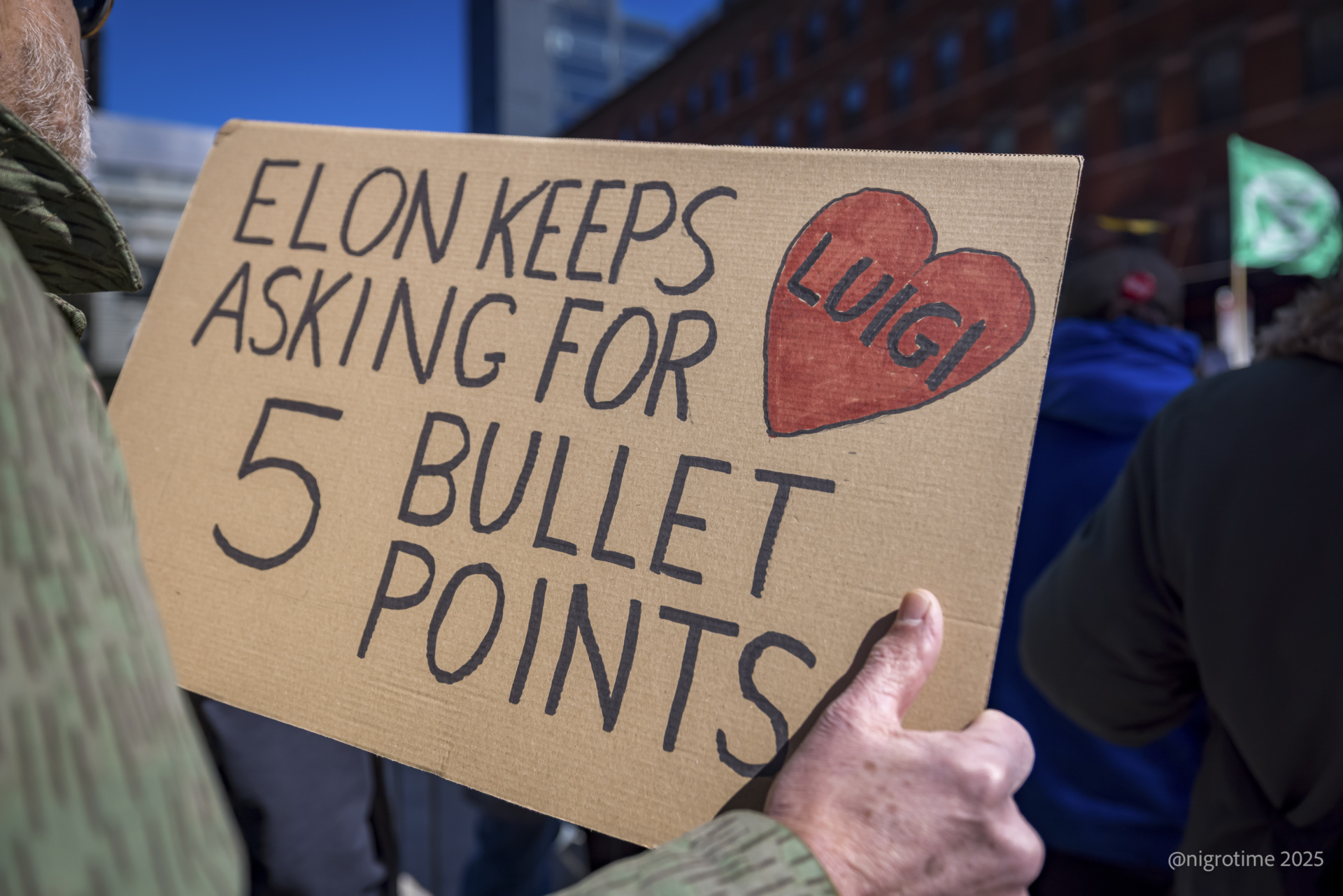 Um manifestante de esquerda segura uma placa do lado de fora de um showroom da Tesla em Manhattan em 8 de março de 2025. (Michael Nigro/Pacific Press/LightRocket via Getty Images)