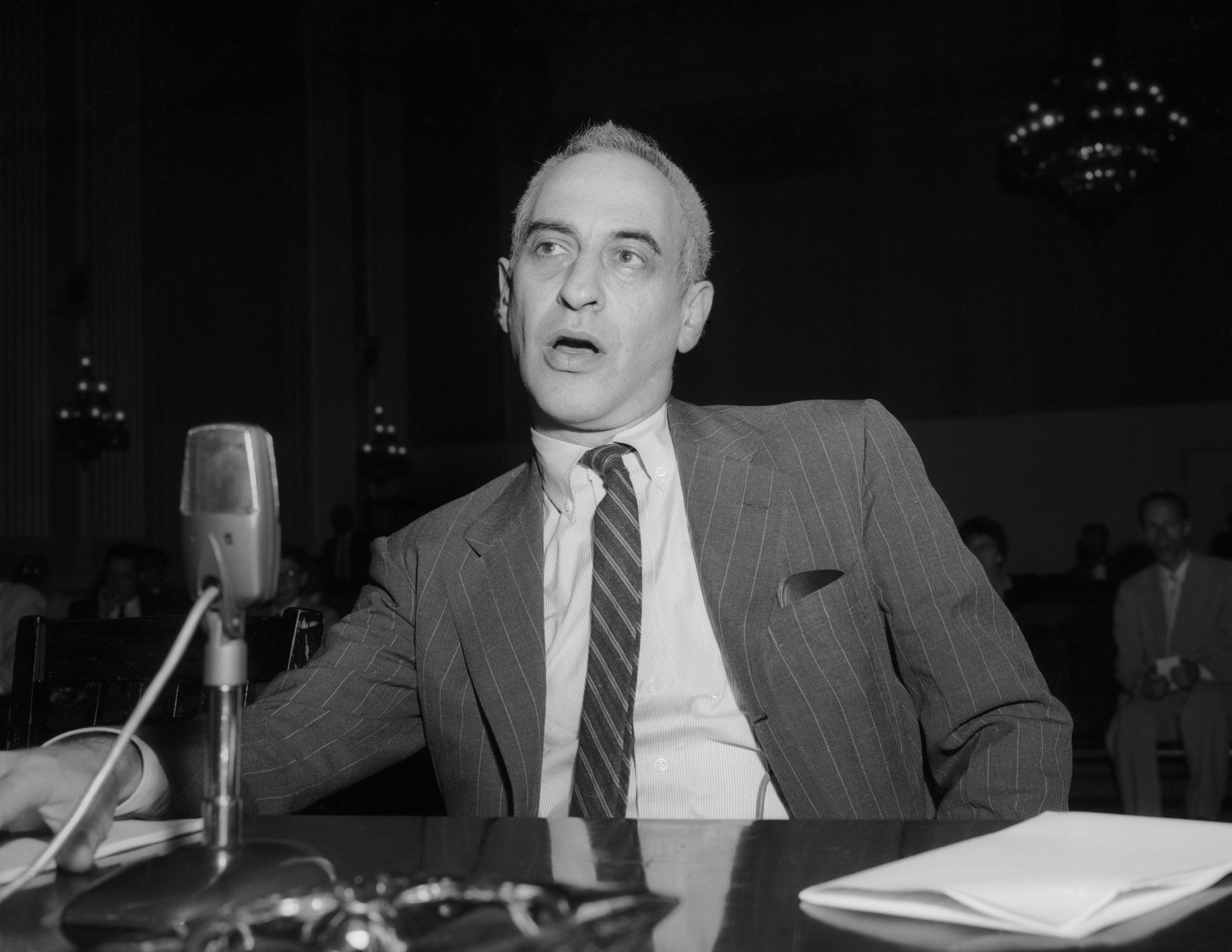 Frank S. Meyer, de Woodstock, Nova York, ex-professor do Partido Comunista, testemunhou perante o Comitê de Atividades Não Americanas da Câmara em julho de 1959 sobre os comunistas trabalhando na educação. Meyer disse que foi comunista de 1931 até romper com o partido em 1945. (Bettmann/Getty Images)