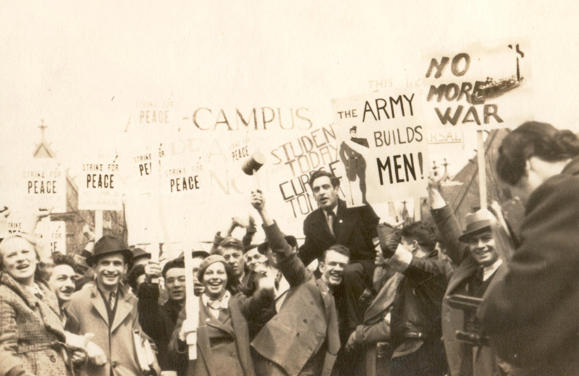 Frank Meyer, canto superior direito, em um protesto pela paz por volta de 1934, quando era membro do Partido Comunista e trabalhava sob Walter Ulbricht, que mais tarde ergueu o Muro de Berlim como ditador da Alemanha Oriental. Em 1962, o conservador Frank Meyer implorou a Nikita Khrushchev que “derrubasse o Muro de Berlim”. (Foto cortesia de Daniel J. Flynn)