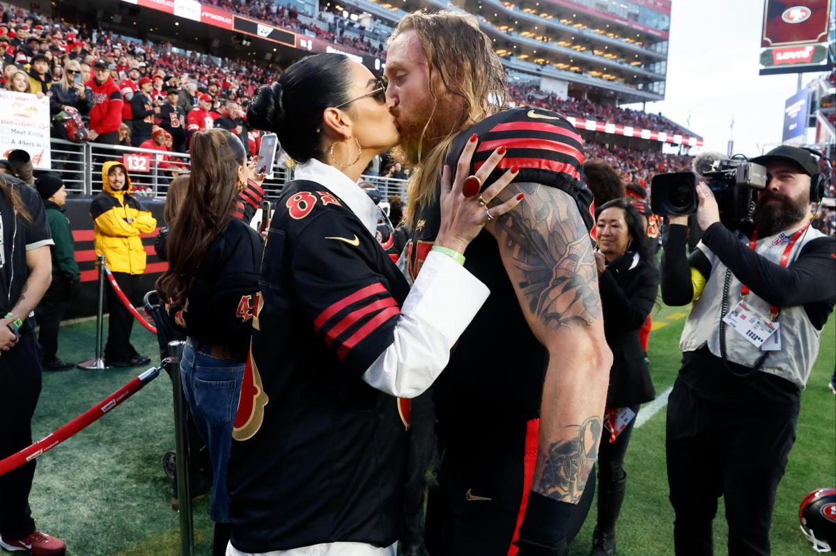 George Kittle e sua esposa Claire Kittle se beijam antes de um jogo do San Francisco 49ers.