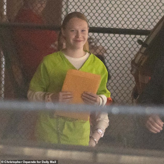 A alegada de 17 anos chegou para sua audiência de fiança em um macacão de prisão verde de neon e seus cabelos trançados enquanto conversava com um companheiro preso