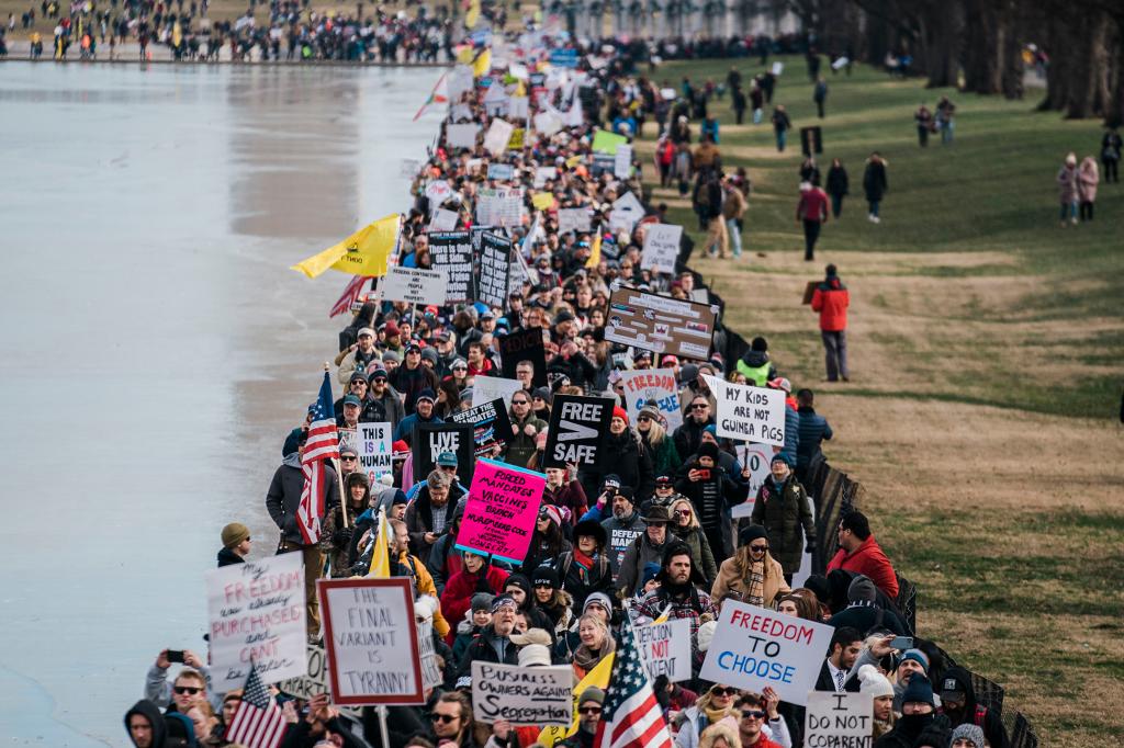 A TSA direcionou as pessoas que se opunham ao mandato da máscara do presidente Joe Biden, como esses 2022 manifestantes. Los Angeles Times via Getty Imag