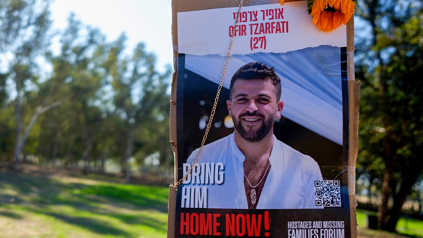 Um manifestante segura um pôster do refém Ofir Tzarfati, 27 anos, durante um comício em Tel Aviv. (Ashley Chan/Imagens SOPA/LightRocket via Getty Images)