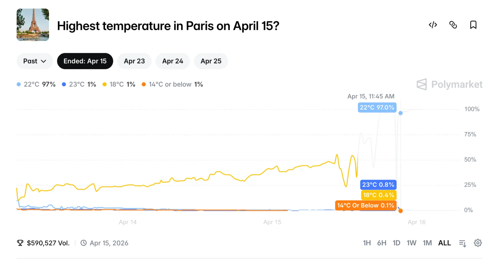 Outro aumento de temperatura igualmente acentuado, de curta duração e difícil de explicar foi relatado em 15 de abril, quando o termômetro relatou outro salto para 22 C ou 71,6 F. Nessa ocasião, outro usuário ganhou mais de US$ 20.000 no Polymarket, que está oficialmente bloqueado e banido na França.
