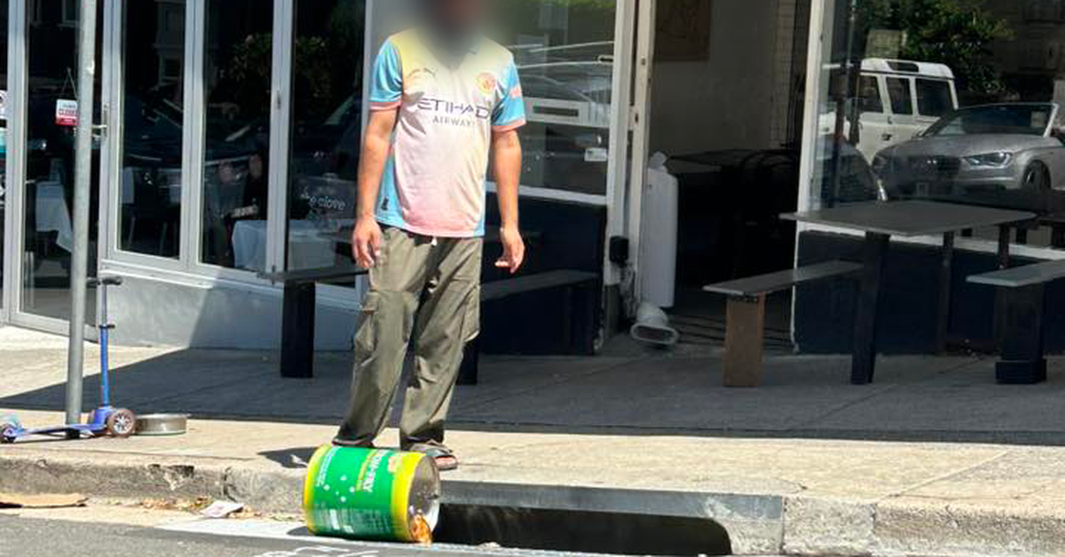 Um vídeo compartilhado nas redes sociais mostrou o homem com um grande contêiner do lado de fora do Grumpy Baker em Coogee no domingo.