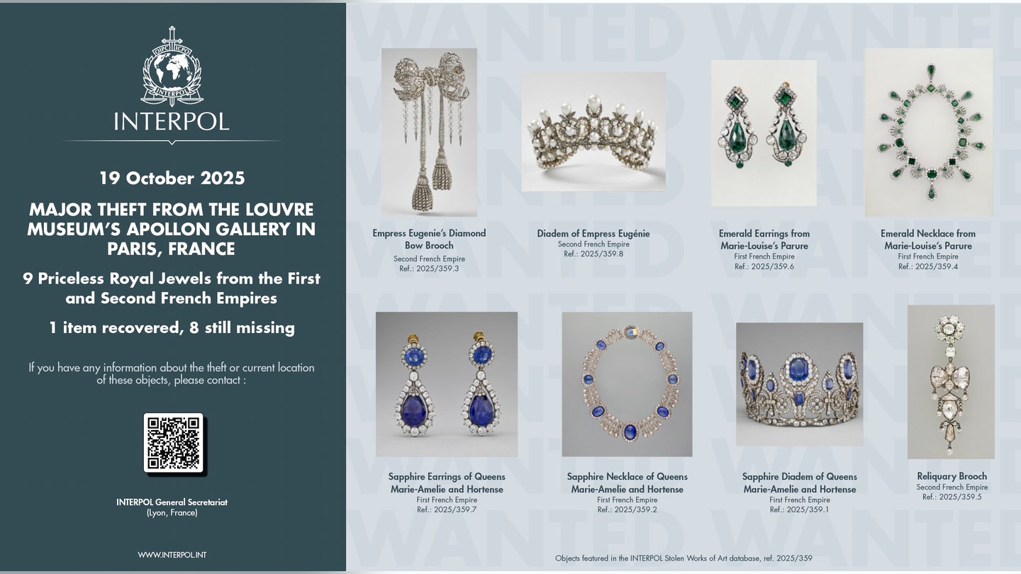 Esta foto fornecida pela Interpol e retirada de seu site mostra as joias roubadas do Louvre no domingo. (Interpol via AP)