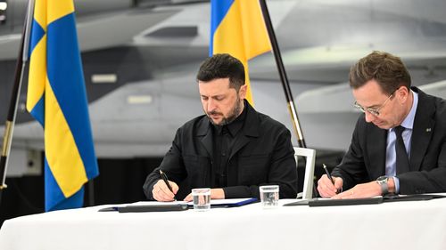 Zelenskyy chegou na quarta-feira a Oslo, Noruega, e depois voou para Estocolmo, onde ele e o primeiro-ministro sueco Ulf Kristersson assinaram um acordo explorando a possibilidade de a Ucrânia comprar até 150 caças Gripen de fabricação sueca durante a próxima década ou mais. A Ucrânia já recebeu F-16 de fabricação americana e Mirages franceses.