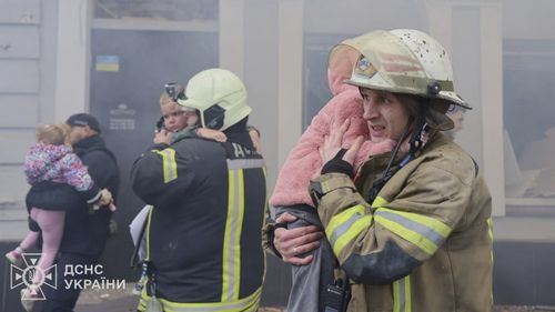 Nesta foto fornecida pelo Serviço de Emergência Ucraniano, equipes de resgate evacuam crianças depois que drones russos atingiram um jardim de infância da cidade. (AP)