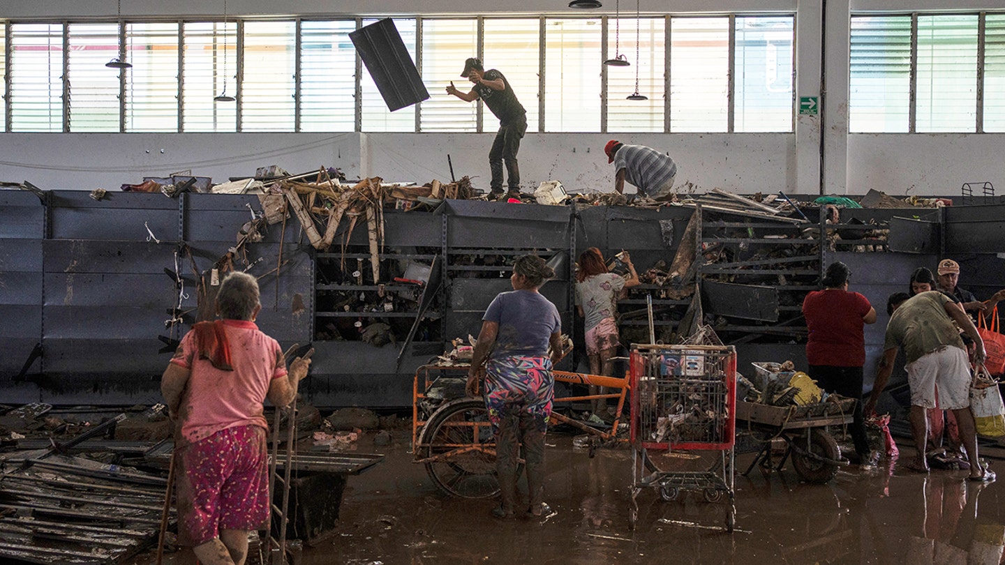 Pessoas saqueiam um supermercado danificado por fortes chuvas em Poza Rica, estado de Veracruz, México, sábado, 11 de outubro de 2025. (AP Photo/Félix Márquez)