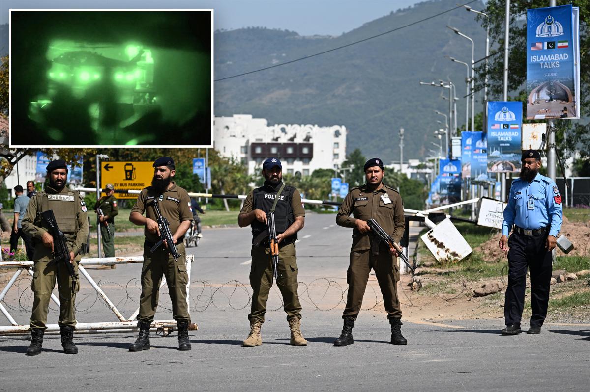 Pessoal de segurança guarda uma estrada temporariamente fechada em Islamabad antes das negociações de paz entre EUA e Irã. AFP via Getty Images